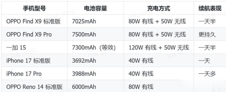 再看看其他几款手机,一加 15 搭载 7300mAh(等效)冰川电池,续航也相当出色,重度使用一天半也不在话下。而 iPhone 17 系列中,标准版电池为 3692mAh,Pro 版为 3988mAh,虽然视频播放时长有所提升,但整体电池容量和安卓阵营相比还是稍显逊色。OPPO Reno 14 系列标准版 6000mAh 电池,续航表现也不错,重度使用一天没问题。